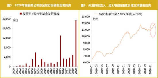 一方面,根据图4,从历史上看,2014-2020年来1月、3月的平均货币、信贷投放水平都较高,央行公开市场操作货币年平均净投放量亦在1月、4月较高(2月为春节假期),每年一季度往往是流动性投放的高峰期;另一方面,国内机构和外资的入市热情不减,亦有望使流动性在边际收紧的大趋势中得到阶段性的喘息,因此,整体看,资金面压力的缓释有望助力股市上涨。