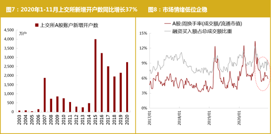 我们一般用换手率、融资买入额占总成交额比重等指标衡量市场的风险偏好,当这两个指标处于高点时,预示市场风险偏好极高,这也往往对应着股市阶段性的高点,而当上述指标处于低点时,预示市场风险偏好极低,而这时往往伴随着市场阶段性的买入点逐渐出现;当前这两个指标处于近三年较低水平,且在近1-2月企稳回升,显示市场情绪已有回暖迹象。