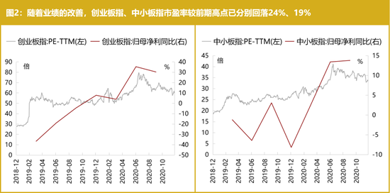 2020年三季度GDP同比增长4.9%,考虑2020年一季度的低基数因素,2021年经济增速大概率突破10%,这意味着企业盈利的增速仍是较为可观的;截至2020.12.29,全A市盈率约19倍,所处近十年分位数从年内高点回落8pct至72%,创业板指、深圳成指、中证500等主要宽基指数PE较此前高点亦已有10%以上的回调,后续随着经济复苏和业绩增速回升,估值进一步被消化吸收,动态估值将变得更加有吸引力。