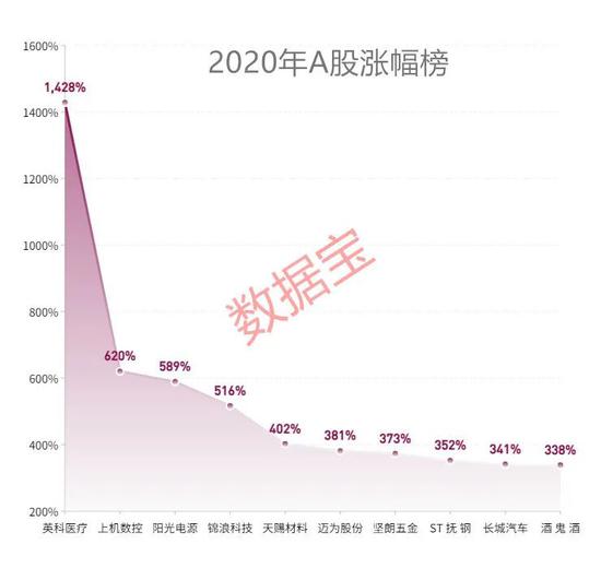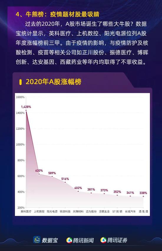 过去的2020年,A股市场诞生了哪些大牛股?剔除去年上市的新股后,数据宝统计显示,英科医疗、上机数控、阳光电源位列A股年度涨幅榜前三甲。由于疫情的影响,与疫情防护及核酸检测、疫苗等相关公司如正川股份、振德医疗、博晖创新、达安基因、西藏药业等去年均累计不小涨幅。