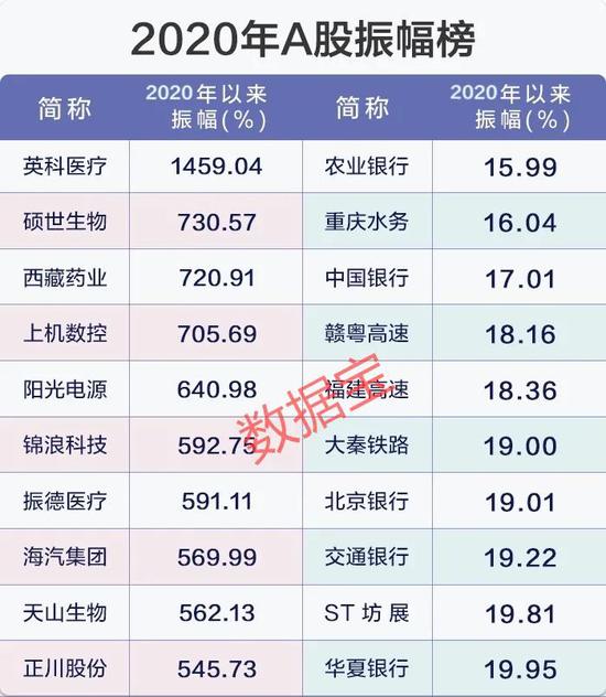 英科医疗、硕世生物、西藏药业、上机数控、阳光电源等排名2020年度A股振幅榜前五位。传统类行业股票相对起伏不大,农业银行、重庆水务、中国银行、赣粤高速、福建高速等2020年振幅不足20%,这些股票大多来自银行、公用事业、交通运输等行业。最淡定的股票是农业银行,2020年振幅仅15.99%,2019年该股也是振幅最小的股票。