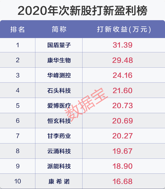 2020年A股共迎来新的上市公司396家,按照上市后首次打开涨停板计算,2020年上市的新股打新盈利平均值为3.25万元,接近历史最高水平。26股打新盈利超过10万元,打新盈利最高的前五位依次是国盾量子、康华生物、华峰测控、石头科技、爱博医疗,国盾量子打新盈利最高,达到31.39万元。