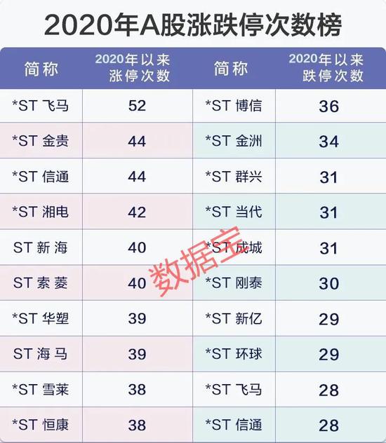 *ST飞马(维权)、*ST金贵(维权)、*ST信通(维权)、*ST湘电、ST新海(维权)等股2020年涨停在30次以上,其中*ST飞马涨停52次,是涨停次数最多的股票,同时该股也是跌停板上的常客,去年累计跌停28次,位居跌停板次数榜单第九位。跌停次数最多的前三位依次是*ST博信、*ST金洲、*ST群兴(维权)。