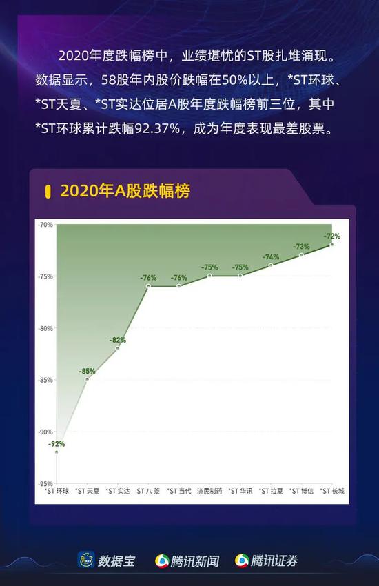 2020年度跌幅榜中,业绩堪忧的ST股扎堆涌现。剔除去年上市的新股后,数据显示,58股去年股价跌幅在50%以上,*ST环球、*ST天夏(维权)、*ST实达位居A股年度跌幅榜前三位,其中*ST环球累计跌幅92.37%,成为年度表现最差股票。