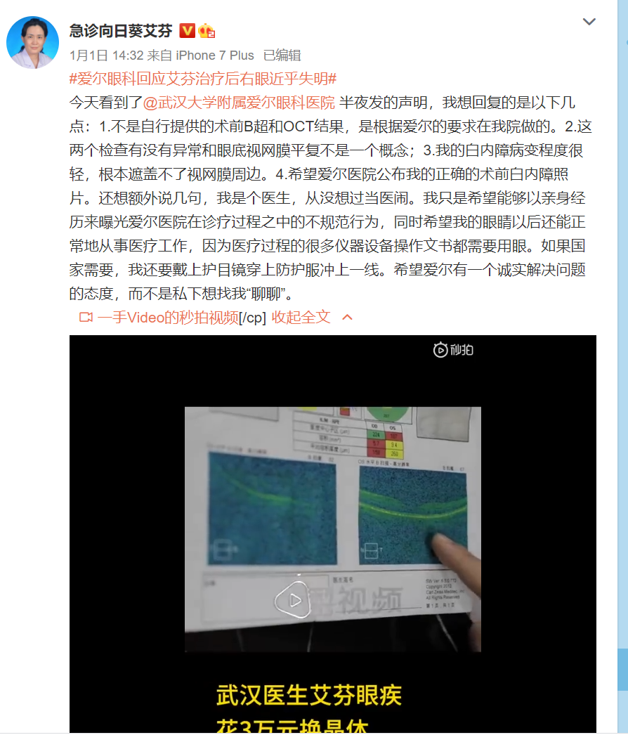 她在个人微博中写道:“我6月初复诊时在他的电脑上亲眼看过,白内障程度非常轻……我作为一名医务工作者,他们都可以这样做,如果是老百姓就更可能被骗。如果我不出来说话,更没有人出来说话了。”