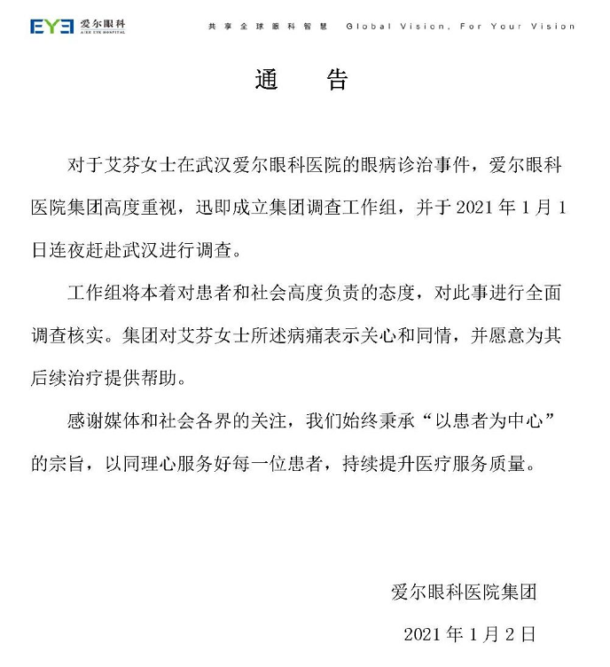 1月2日上午,上市公司爱尔眼科医院集团针对此事首度发声。其微信公众号发表声明称,集团对此事件高度重视,已迅即成立集团调查工作组,于2021年1月1日连夜赶赴武汉进行调查。“工作组将本着对患者和社会高度负责的态度,对此事进行全面调查核实。集团对艾芬女士所述病痛表示关心和同情,并愿意为其后续治疗提供帮助。”