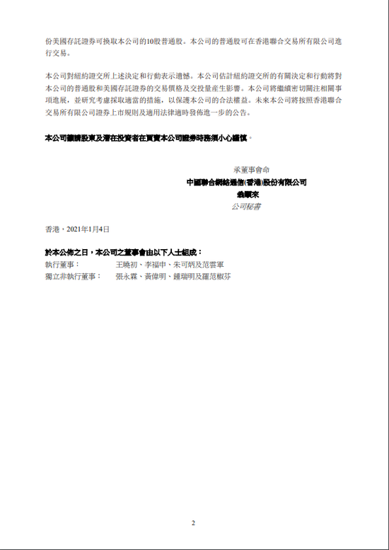 中国联通公告,于本公告发布之时,本公司尚未收到纽约证交所就上述将本公司美国存托证券下市之决定之任何通知。本公司对纽约证交所的决定和行动表示遗憾。本公司估计纽约证交所的有关决定和行动将对本公司的普通股和美国存托证券的交易价格及交投量产生影响。本公司将继续密切关注相关事项进展,并研究考虑采取适当的措施,以保护本公司的合法权益。