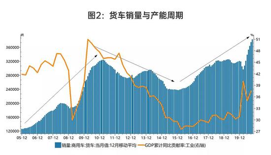 用微观视角看工业系统,能发现更直观的证据:工业体系的运转,要用到货车、挖掘机等,工业运转越旺盛,用到的货车也就越多。货车的销售量理应与产能周期的凉热保持一致,如图2。