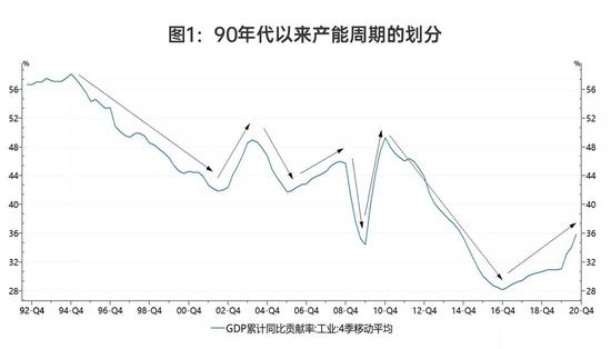 数据来源:国家统计局。(1)2005年开始进入一轮产能周期趋势性上行,其中2008年受到次贷危机干扰,但干扰得到了政策对冲之后延续至2011年。(2)2020年一季度的凹点是国民处于冻结状态时的情况。(3)工业对GDP的贡献中枢不断下移,也是工业化进程的合理现象。