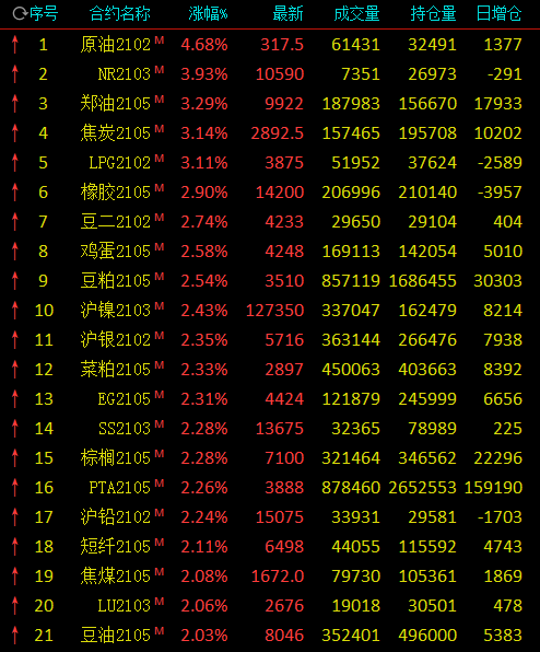 热点栏目1月4日,国内期市早盘大面积上涨,宏观情绪向好,原油涨近5%,20号胶涨近4%,橡胶涨近3%;油脂油料大涨,菜油涨逾3%,豆二、豆粕、菜粕、棕榈油、豆油涨逾2%;黑色系中,焦炭涨逾3%,焦煤涨逾2%,动力煤跌近1%。鲜果走跌,苹果跌近2%。