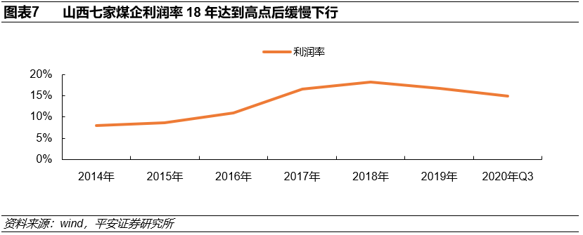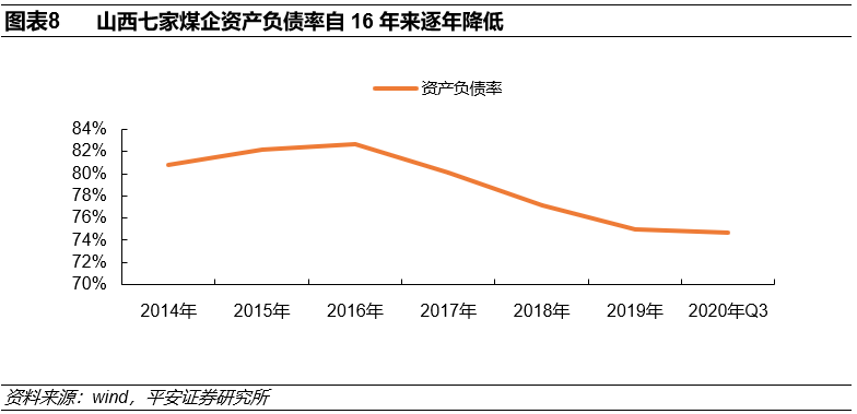 从煤炭企业的财务指标来看,随着煤价上升,煤企经营性现金流明显改善,并开始主动去杠杆。我们以山西的同煤集团、焦煤集团、晋能集团、阳煤集团、潞安集团以及山西煤炭进出口集团为整体,计算煤企的现金流等财务指标。14-15年煤价低迷,煤企经营性净现金流表现较弱;但外部融资环境相对宽松,筹资性现金流表现为净流入,最终实现现金及现金等价物基本持平,煤企资金链高度依赖融资现金流的支撑。随着供给侧改革逐渐发力、煤价回暖,煤企利润率16年以来开始逐渐好转,工业企业利润数据来看利润率从2016年2月的-0.29%回升至2017年12月的11.64%;山西七家煤企利润率从14年7.95%逐年升高至18年的18.15%,19年、20年Q3缓慢回落,截至2020年Q3,山西七家煤企利润率为14.9%。伴随着16年-17年煤企经营性现金流大幅改善,山西七家煤企经营性净现金流从15年末的167亿上升至17年末的509亿。16年下半年以后煤企杠杆率整体开始下降,从工业企业利润数据来看,煤企资产负债率从2016年4月高点的70.23%,3年内下降约5%左右;山西七家煤企资产负债率从2016年的高点82.62%,3年内下降约7.65%至74.97%。