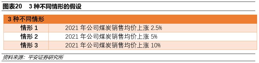 我们以陕煤化、晋煤、焦煤、平煤化为例,分别测算了四家煤企在煤炭销售均价改善的不同情形下,其经营性现金流的改善程度。我们假设煤炭销量、原煤产量、吨煤成本同2019年不变,2020年煤炭销售均价同2019年不变,测算了3种可能的情形:情形一是2021年公司煤炭销售均价上涨2.5%,情形二是2021年公司煤炭销售均价上涨5%,情形三是2021年公司煤炭销售均价上涨10%。