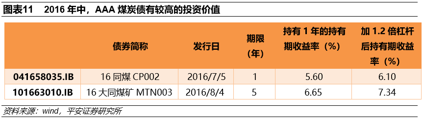(2) 我们以2016年6月前后同煤发行的两笔AAA煤炭债测算,1年期和5年期的债券持有一年的收益率分别高达5.60%和6.65%,考虑1.2倍杠杆后收益率高达6.72%和7.34%,收益率非常可观。“16同煤CP002”发行于2016年7月初,发行期限1年,持有1年的票面利率为5.60%,考虑1.2倍杠杆后综合收益率6.10%;“16大同煤矿MTN003”发行于2016年8月初,发行期限5年,从发行日开始算起,持有1年的持有期收益率6.65%,考虑1.2倍杠杆后的持有1年的持有期收益率7.34%。2016年底央行收紧货币政策以后债市转熊,相比之下,同期10年期国开债的持有期收益率在-5%左右,煤炭债信用利差的大幅压缩较好的防御了同期利率债收益率上行的风险,获得了很不错的收益。
