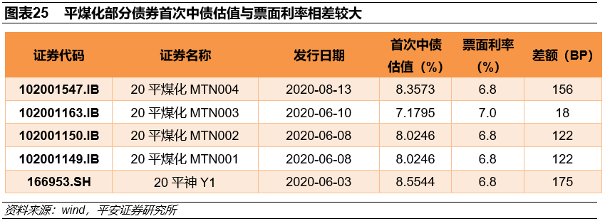 一是需要关注部分债券的二级市场报价和同一时期的一级市场发行价的背离,表现在首次中债估值收益率与其票面利率有较大差距,如平煤化2020年6月后所发债券中,多只债券首次中债估值均高出其票面利率100BP,甚至部分接近200BP。