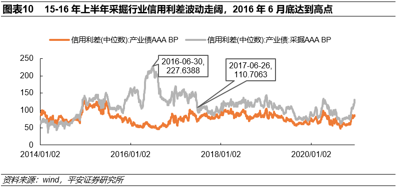 因此,16年中是煤炭债非常好的投资时机:如前文所述,2015-2016年上半年煤企经营性现金流弱,较依赖筹资性现金流的净流入;在2016年以来供给侧改革提升煤价的背景下,煤企的经营性现金流确定性改善,只要融资不大幅收紧,则行业整体资金链大概率有明显改善。因此,彼时的AAA煤炭债有较高的投资价值。