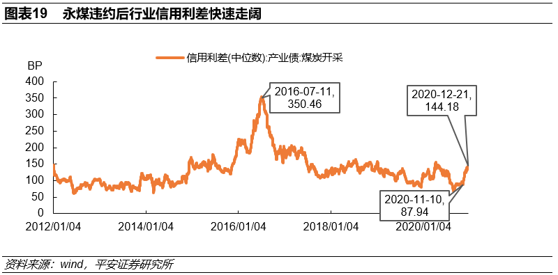 永煤违约后,煤炭行业信用利差快速走阔,从11月10日的88BP走扩至目前的144BP,走阔幅度约60BP,如20晋能MTN018收益率从11月10日的4.7958%上升89BP至12月18日的5.6867%,20陕煤化MTN005收益率从11月10日的4.5577%上升61BP至12月18日的5.1655%。当前煤炭债的信用利差虽然显著不及2016年高点水平,但也位于2012年以来的历史70%分位数附近,有一定的安全垫。