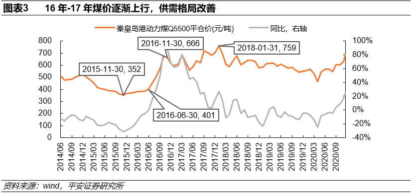 2016年以后,煤炭行业产能逐渐有序退出,行业供需格局改善,煤价回暖。从煤企库存水平来看,2016年煤企库存水平逐月下降,2017年2月煤企存货同比下降20%。随着供需格局逐渐改善,16年-17年煤价也逐渐上行,秦皇岛动力煤平仓价从15年11月底的352元上升至2018年初的759元。