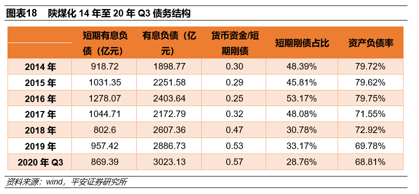 同样以陕煤化为例,我们观察到陕煤化的债务结构2016年以来确有改善。陕煤化货币资金对短期刚债的覆盖率从16年起逐年上升,截至2020年Q3货币资金对短期刚债覆盖率达0.57倍,较16年的0.25倍上升了0.32倍;短期刚债占比逐年下跌,截至2020年Q3短期刚债占比为28.76%,较16年的53.17%下跌了24.41%;资产负债率也逐年下降,截至2020年Q3陕煤化资产负债率为68.81%,较16年的79.75%下跌了10.94%。