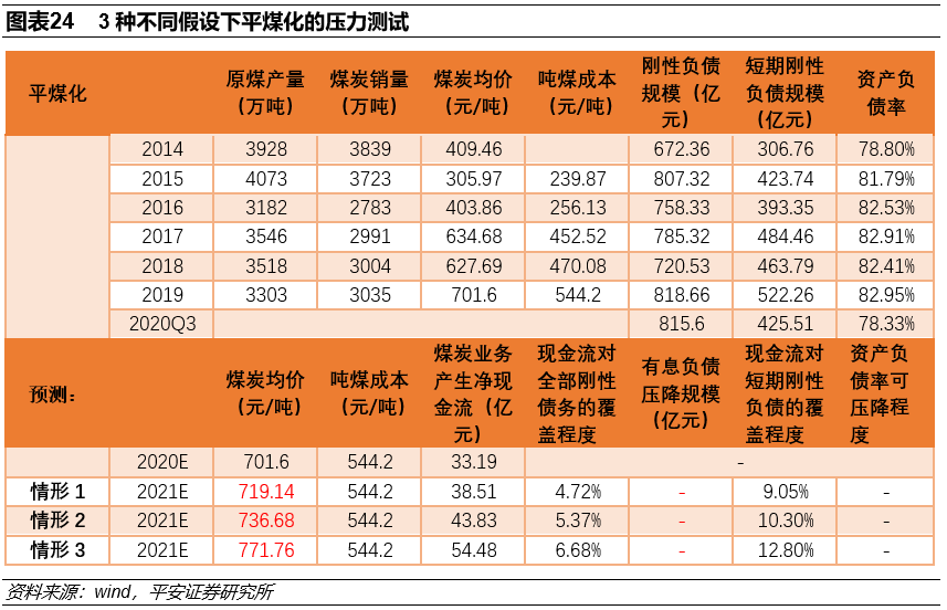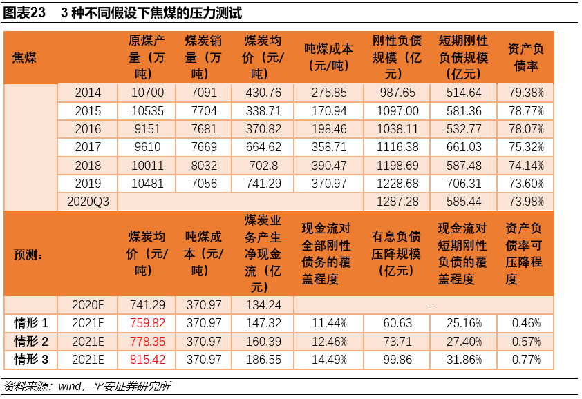 (2)三种假设情形下,2021年焦煤煤炭业务产生的净现金流对其短期刚性债务的覆盖率分别为25.16%、27.40%和31.86%。如果假设其2021年融资成本不变,则以其煤炭业务产生的现金流在三种假设情形下分别可以承受短期刚性负债压降60.63亿、73.71亿和99.86亿,对应其整体资产负债率可以下降0.46%、0.57%和0.77%。