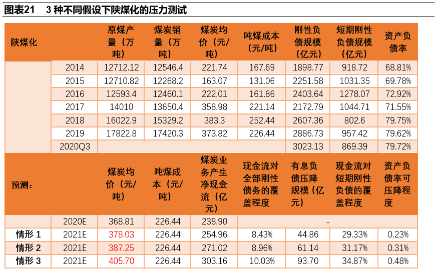 (2)三种假设情形下,2021年陕煤化煤炭业务产生的净现金流对其短期刚性债务的覆盖率分别为29.33%、31.17%和34.87%。如果假设其2021年融资成本不变,则以其煤炭业务产生的现金流在三种假设情形下分别可以承受短期刚性负债压降44.86亿、61.14亿和93.70亿,对应其资产负债率可以下降0.23%、0.31%和0.48%。