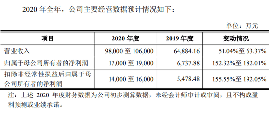公司预计2020年实现营收约11亿元至13亿元,同比增长约34.17%至58.57%;预计实现归母净利润约2.7亿元至3.2亿元,同比增长约87.35%至122.05%。