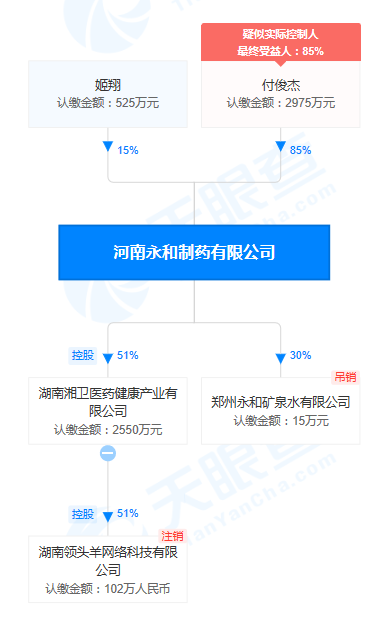 付俊杰是持股85%的大股东,也是法定代表人、董事长兼总经理,湖南湘卫医药健康产业有限公司(原湖南大森林医药有限公司)是河南永和制药旗下子公司。