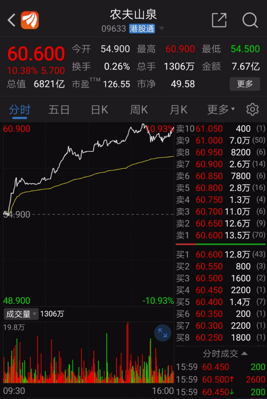 截至1月4日收盘,农夫山泉收报60.6港元,涨幅10.38%,总市值达6821亿港元(约合人民币5683.94亿元),盘中涨幅最高达10.93%,股价首次突破60港元,创历史新高,市盈率达126.55倍。