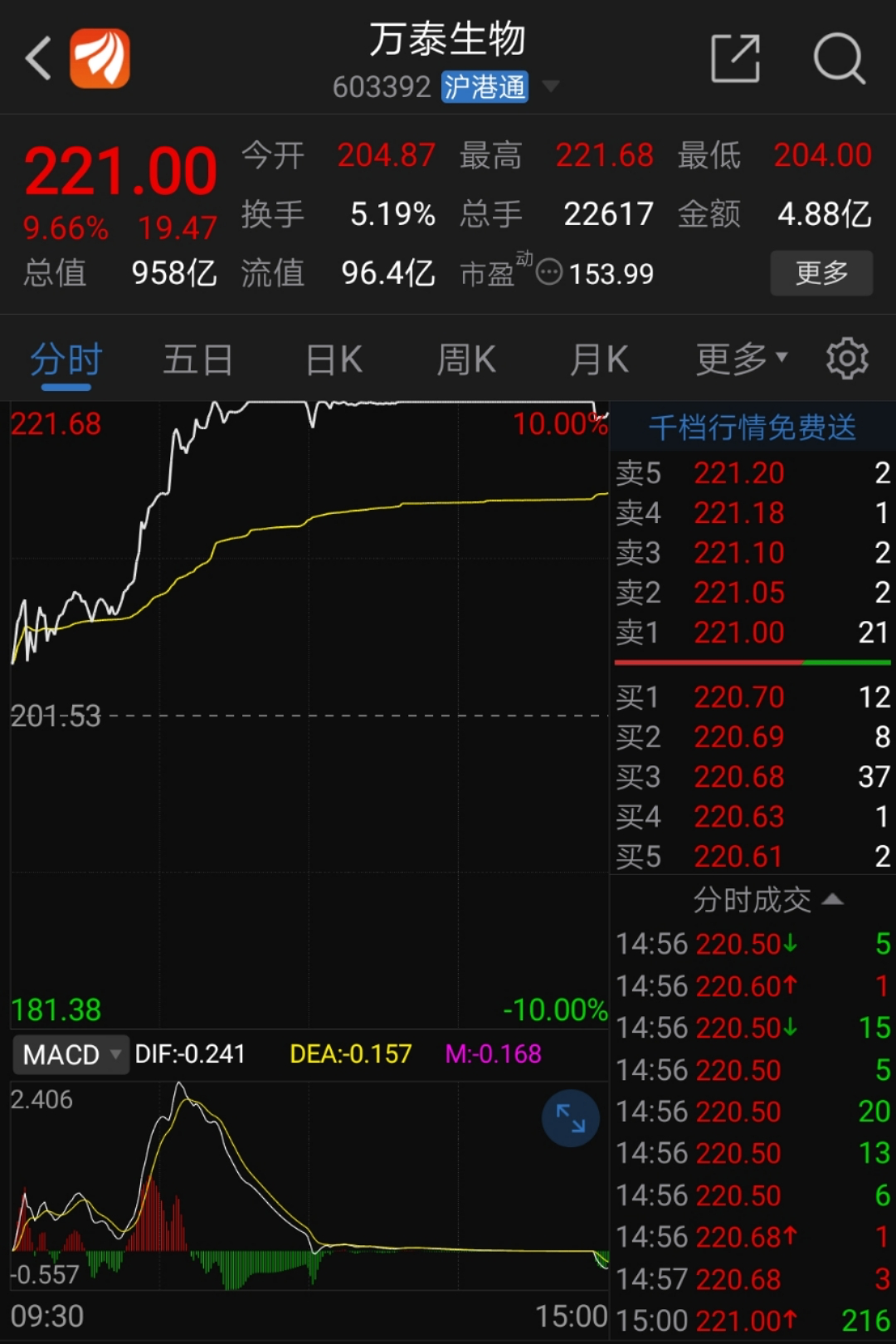 钟老板旗下另一家实控上市公司万泰生物今日收报221元,盘中一度涨停,尾盘开板,收盘上涨9.66%,总市值达958亿元。