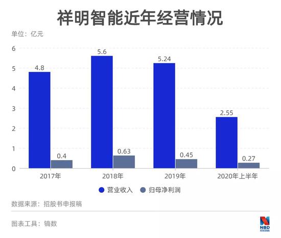 2017~2019年及2020年上半年,祥明智能分别实现营业收入4.8亿元、5.6亿元、5.24亿元和2.55亿元,归母净利润分别为3993.11万元、6267.71万元、4475.39万元和2729.15万元。