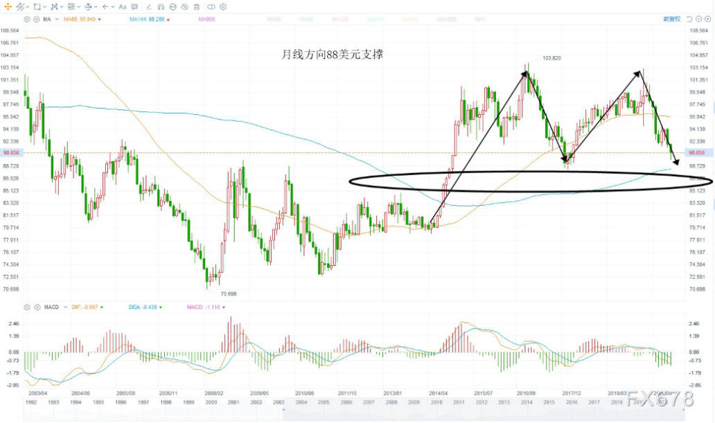 (欧元兑美元月线图)周线方面,目前斜率已经给出上涨结构,因此前期平台1.1950附近不再跌破的前提下由于突破水平箱体压力,给到通道上沿压力1.2900,此位置是周月线共振压力,很难突破。
