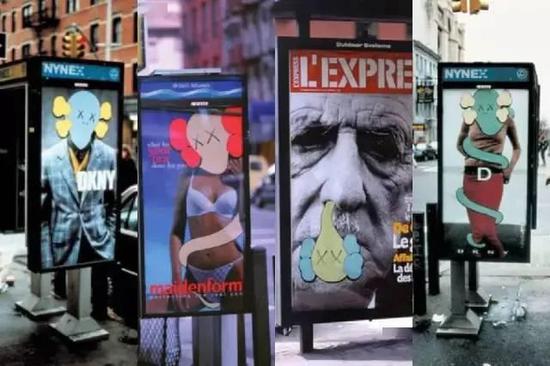 慢慢地,一个经过处理的骷髅头和 xx 眼,成了 KAWS 最爱画的图案。他每晚在大街游走,把这个有点邪恶,又有点丑萌的骷髅头画在各式广告牌上,等待白天清洁工或者警察出面,把这些‘非法涂鸦’清除。