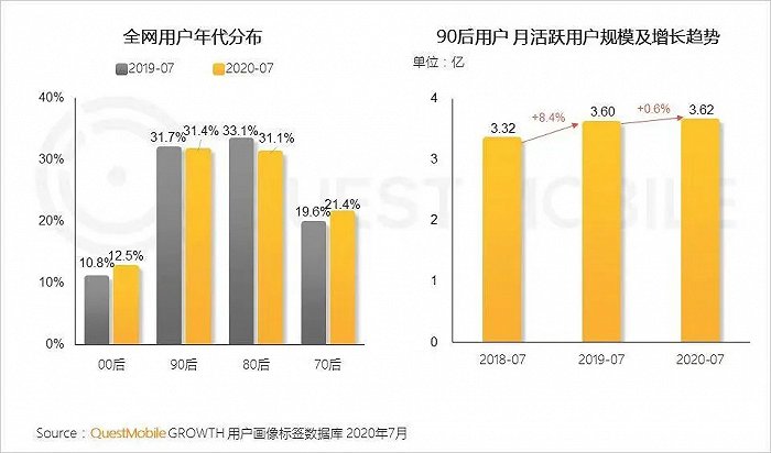 QuestMobile 发布报告数据称,截止 2020 年 7 月,90 后用户数量再创新高,达3.62 亿,占全网 31.4%,正式取代 80 后(31.1%)成为移动互联网新主流人群。而天猫的数字也显示,90 后无论在下单金额还是下单件数上,都赶超了“80 后”,成为主力消费者。