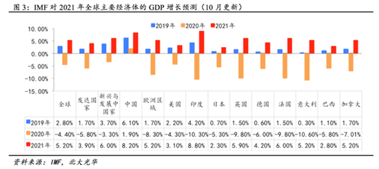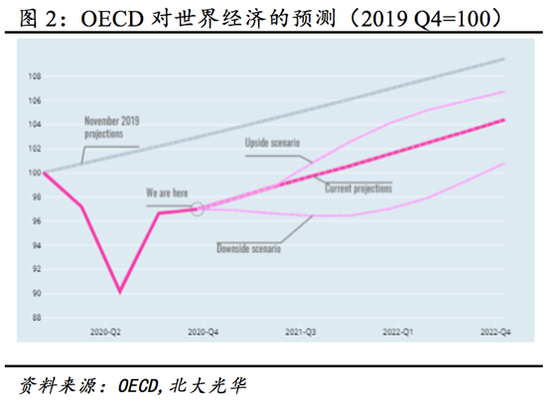世界经济短期内仍将承压。新冠肺炎疫情是导致2020年世界经济受到严重冲击的主要原因。秋冬季节世界多国疫情再次爆发,欧美国家新增确诊人数仍然处于高位(见图1),中短期来看疫情仍将令全球经济在一定程度上承压。纵然全球新冠疫苗(以BioNtech-辉瑞、Moderna、AZ等为代表)三期临床结果顺利,疫苗接种渐行渐近,2021年世界经济将走出衰退,普遍出现恢复性增长,但GDP增速低于假设未发生疫情的正常经济增长水平(见图2)。