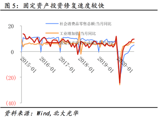 得益于精准及时的政策支持,2020年我国经济实现V型反转,三季度GDP累计增速扭负转正(图4)。但当前经济恢复基础仍不牢固,为经济增长提供支撑的房地产投资、基建投资与进出口今年面临地产调控政策、财政压力与国外需求的不确定性,消费恢复较为滞后,内需提振尚需时日(图5)。由于去年的低基数效应,今年一季度经济增速或将跳至高位,但不应因此对形势过于乐观,随着经济修复动能逐渐减弱,尤其今年下半年经济回归正常轨道之后,经济增长可能因动力不足而再次面临较大压力。