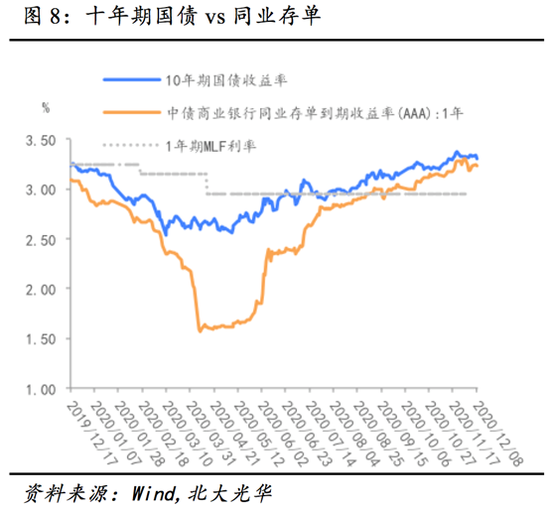 再次,我们认为应更加关注长端利率对信用债市场的影响,并强化MLF的中枢作用。由于永煤、华晨等地方国企违约,近期同业存单以及十年国债利率持续上升,说明永煤事件已对总体流动性造成了影响,波及到利率债市场(图8)。在流动性分层、信用利差走阔的同时,一级市场信用债取消发行的规模快速上升。现阶段若过早收紧货币政策,将加大企业的融资难度,增大企业债务违约可能。目前政策性利率的中枢作用主要在逆回购上有所体现,对短端利率有着较强的指导性作用。MLF利率的中枢性作用较弱,主要体现在指导LPR利率。每月月中操作的MLF对十年期国债收益率的影响较小,十年期国债收益率与同业存单收益率已远远偏离政策性利率。未来央行应更加关注政策性利率对十年期国债收益率的传导作用,通过影响长端利率水平提高货币政策的传导效率。