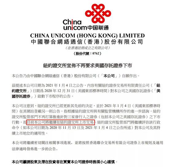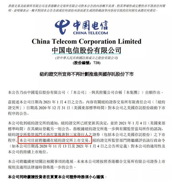 在公告中,纽交所称,鉴于与相关监管机构进行了进一步磋商,纽交所监管局不再打算推进于2020年12月31日宣布的中国电信、中国移动、中国联通三个发行人有关的退市行动。