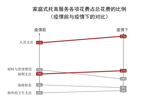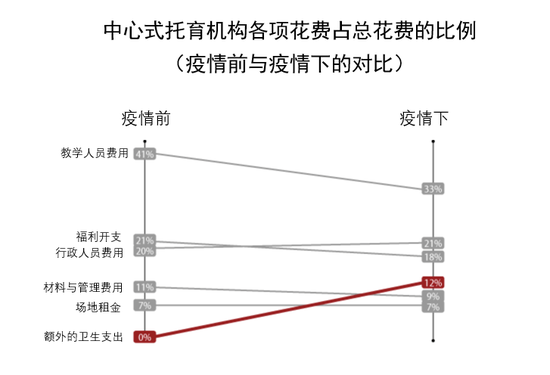 中心式托育机构的卫生开支显著增长,这项开支从疫情前平均占机构预算的0%增加到12%,教学人员费用则从41%降低至33%。在家庭式托育机构中,人员开支也从51%增长到了57%。人员配备费用和卫生用品费用将提高托育成本。