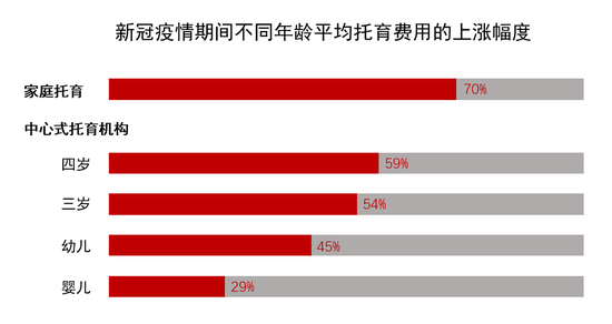 疫情期间,学龄前儿童托育费用比婴幼儿托育费用上涨幅度更大。据估计,与疫情前相比,中心式儿童托育机构的费用平均上涨了47%,家庭式的托育费用则上涨了70%。