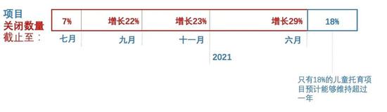 截至2020年7月有7%左右的项目关停,2020年9月这一数字增加22%,11月增加23%,2021年6月可能会再增加29%。只有18%的托育项目预计能维持运转一年以上。