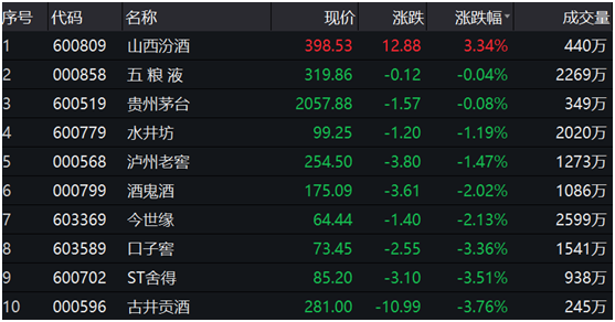 上午收盘时整个白酒板块翻绿,仅剩下山西汾酒(600809.SH)涨3.34%。同时,多只小盘股出现大幅回调。