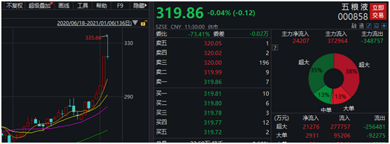 1月6日,贵州茅台(600519.SH)股价开盘上冲,最高站上2125元;五粮液(000858.SZ)也再创新高,盘中股价超过335元,最高涨幅近5%,市值一度突破1.3万亿元。