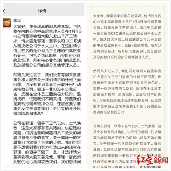 据媒体报道,郭谨一发表全员信之后,周斌和李军在微信朋友圈发文回击。两人表示,已经掌握了大量郭谨一贪腐实证。据称,联名请求信参与人几乎囊括瑞幸所有中高层业务骨干,郭谨一在全员信中是在混淆视听,进行诋毁和污蔑。