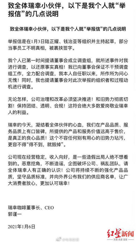 郭谨一称,网上流传的举报信是在 1 月 3 日由陆正耀、钱治亚等组织并主持起草,部分当事员工不明真相,被裹挟签字。