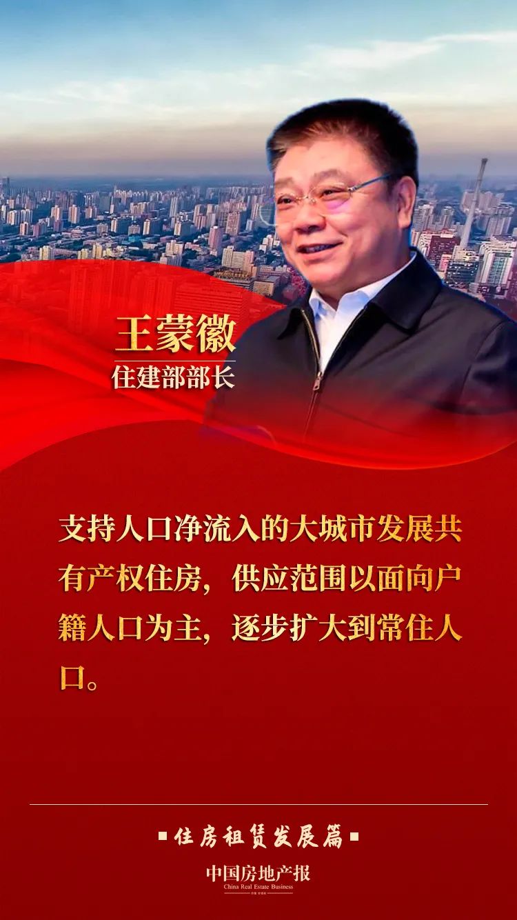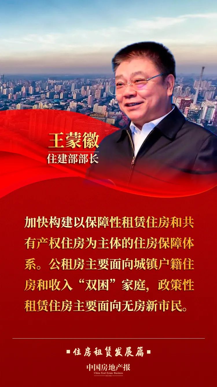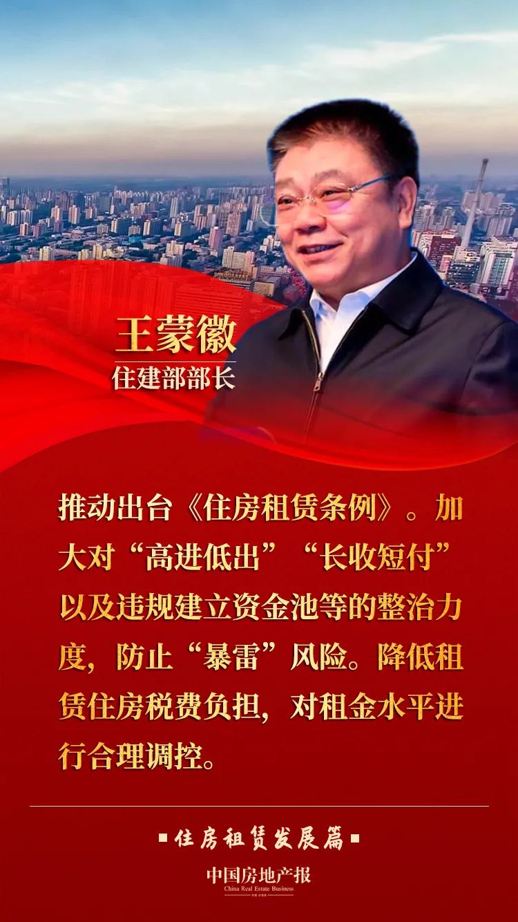 王蒙徽表示,大城市房价高,租赁市场也存在着供应结构不合理、市场秩序不规范、租赁关系不稳定等问题,新市民、青年人特别是从事基本公共服务人员等群体的住房困难问题比较突出。要重视解决好这部分群体的住房问题。要加快构建以保障性租赁住房和共有产权住房为主体的住房保障体系,推动出台《住房租赁条例》,加快完善长租房政策。