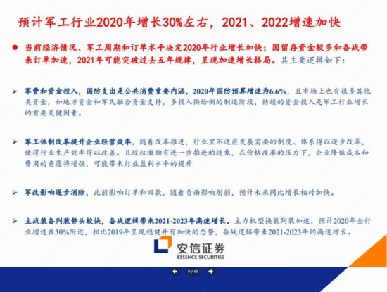 我们最近一次报告给的预测是2020年是9.3亿左右,2021年是13.5亿,增速也非常快,而且估值还比较低,以前长期是在20多倍,经过最近的上涨也提升到30多倍的水平上,但在军工里面还是比较低的。