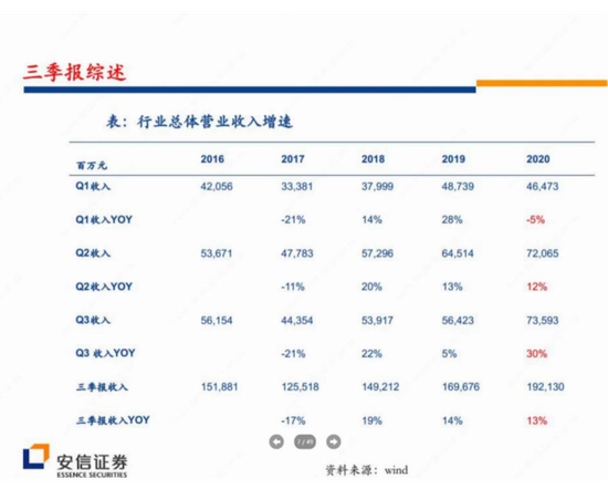 一个是收入增速,我们可以看到这个表里面的红色字体部分,2020年单个季度的收入是逐级增加的,到了第三季度的时候,都已经单季度收入增长达到了30%,前三季度的收入增速也达到13%。