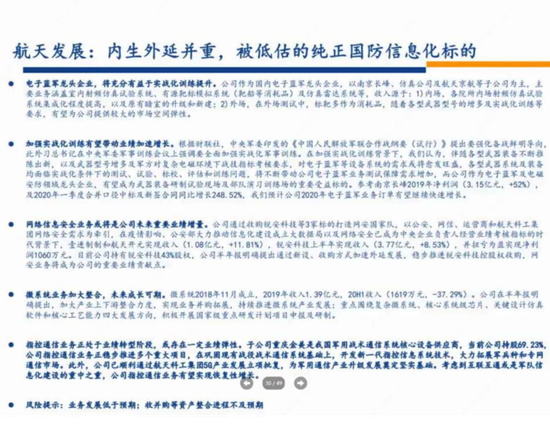 信息化系统包括一些通信系统、电子蓝军系统等等信息安全系统。三年左右时间里,我们重点推荐的系统标的还是航天发展。
