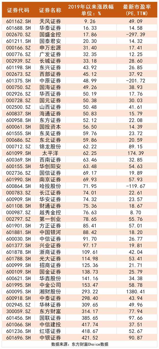 从目前的市场上来看,多家券商看好券商股的投资价值,翻翻那些券商股,实际还有很多估值又低并且股价又没怎么表现的品种。以下是A股券商股2019年以来的涨跌幅以及估值: