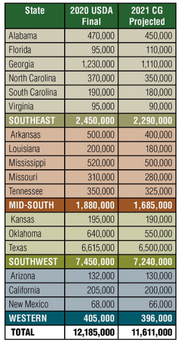 美国《棉农杂志》的植棉意向调查从2020年11月开始,到12月初结束,收集的反馈来自棉农、轧花厂、专家顾问和其他行业渠道。今年2月美国国家棉花总会(NCC)将发布意向面积报告,3月底美国农业部将发布官方的意向种植面积,这些预测将反映出不同时间节点的意向面积。