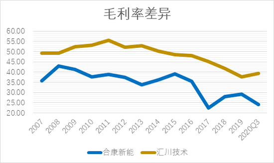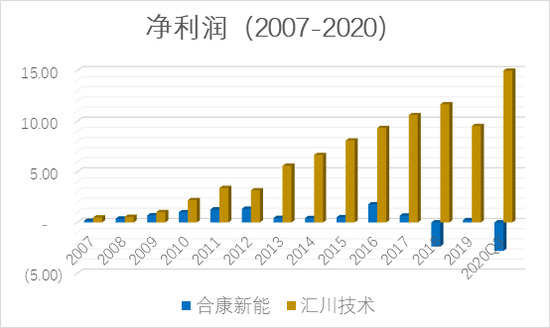 图表显示,汇川技术大部分时间都远好于合康新能,即使在净利润未决出胜负的2007-2009。